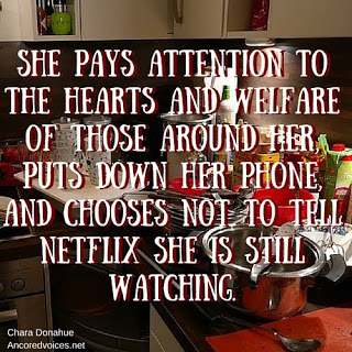 She looks well to the ways of her household and does not eat the bread of idleness.-Proverbs 31:27 (My paraphrase: She pays attention to the hearts and welfare of those around her, puts down her phone, and chooses not to tell Netflix she is still watching.)
