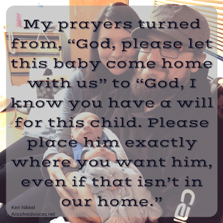 No matter the outcome, God knew what was best for the baby and for our family. My prayers turned from, “God, please let this baby come home with us” to “God, I know you have a will for this child. Please place him exactly where you want him, even if that isn’t in our home.”