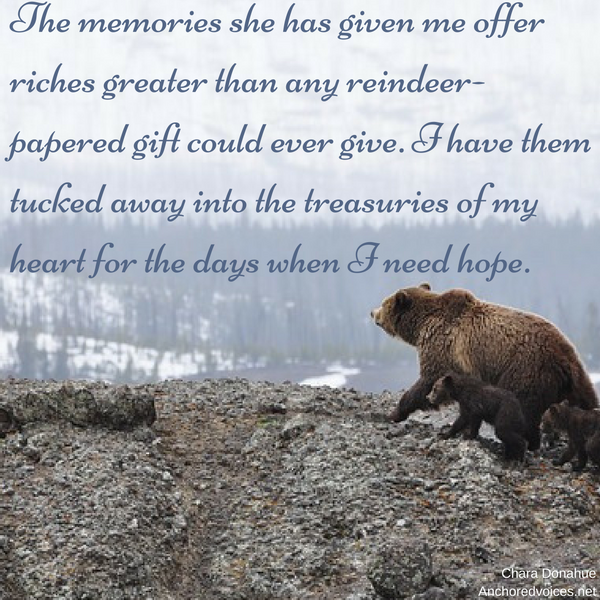The memories she has given me offer riches greater than any reindeer-papered gift could ever give. I have them tucked away into the treasuries of my heart for the days when I need hope. I will always be grateful for the worn Bible that often laid open upon her bed, her constant presence, and the way she offered children who had experienced deep sorrow a place of peace.
