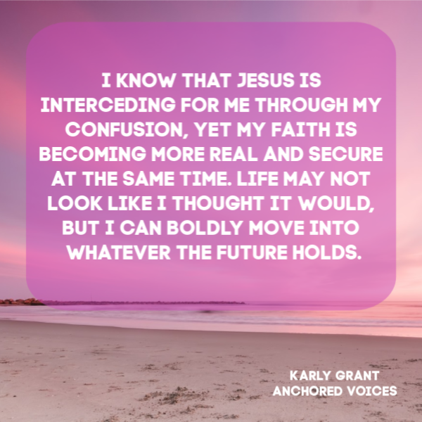 Because of this truth, I can boldly approach my Father in prayer, bringing my real self, not having to make things pretty and pleasing to people. I know that Jesus is interceding for me through my confusion, yet my faith is becoming more real and secure at the same time. Life may not look like I thought it would, but I can boldly move into whatever the future holds. I’m hoping for less desert and more promised land, but even if God has more wandering ahead, I know He hears, sees, and cares for me. Day by day God conquers fear and shows himself trustworthy. Day by day He makes my faith bold.