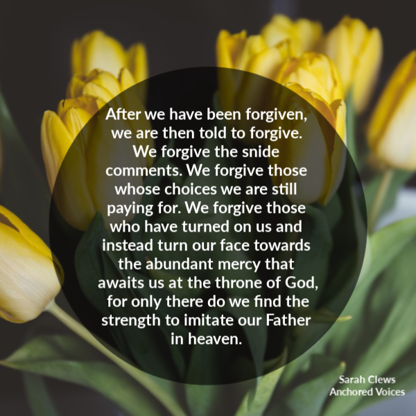 After we have been forgiven, we are then told to forgive. We forgive the snide comments. We forgive those whose choices we are still paying for. We forgive those who have turned on us and instead turn our face towards the abundant mercy that awaits us at the throne of God, for only there do we find the strength to imitate our Father in heaven. Instead of letting the pain fester we allow it to heal by choosing the way of abundance Jesus has offered.