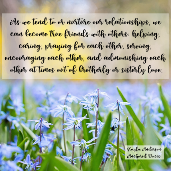 - When we love our brothers and sisters and continue in fellowship with them, we continue to grow ourselves. We continue to see the needs of others and can practice the command of treating others as more important than ourselves. (Phil. 2:3) As we tend to or nurture our relationships, we can become true friends with others: helping, caring, praying for each other, serving, encouraging each other, and admonishing each other at times out of brotherly or sisterly love. We can live abundantly in our life by being in community with fellow believers and point each other back to what Christ says about the ways we ought to live.