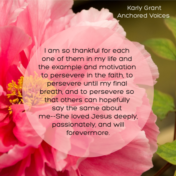 All of these people and several more have been examples to me of what a life looks like that perseveres in the faith. Each of these sad moments of losing someone close has also led me closer to my Savior, whom they are worshiping with for all eternity. I am so thankful for each one of them in my life and the example and motivation to persevere in the faith, to persevere until my final breath, and to persevere so that others can hopefully say the same about me–She loved Jesus deeply, passionately, and will forevermore.