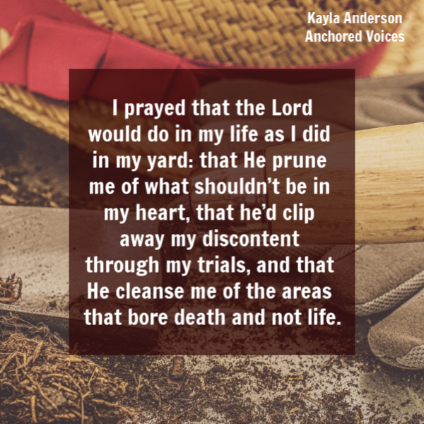 I stood to fight it and argue with God’s Word – I don’t want to consider my trials pure joy. I’m not sure I even can. The past few months have felt like they are killing me; joy and life are the very last things I feel like I can muster up. I thought, processed, prayed, and repented as the yard became my counselor that day. I prayed that the Lord would do in my life as I did in my yard: that He prune me of what shouldn’t be in my heart, that he’d clip away my discontent through my trials, and that He cleanse me of the areas that bore death and not life.