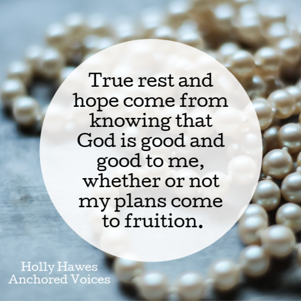 I eventually did restring those freshwater pearls in the weeks before my wedding. Several lengths of clear fishing wire held the rough pearls, knotted, and strung through in a way that both braided the individual strings together and left solitary pearls dangling resolutely in their own space. To keep on hoping we must let the master designer craft our life in this way. Our hope isn’t in the plan turning out neatly, but our hope rests on God who knows the best way to put the totality of our lives together.