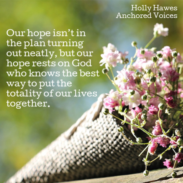 My tidy little line of expectations couldn’t hold under the weight of life in a broken world. They may have been “normal” expectations for life, but good desires unfulfilled led me to question the goodness of God, who had never promised me neat or tidy. My hope couldn’t rest on the things God may or may not grant me in life. True rest and hope come from knowing that God is good and good to me, whether or not my plans come to fruition. I continually come back to Psalm 16:5, “Lord, you are my portion and my cup of blessing; you hold my future.” When my hope is in God, who gives me all I need, I can keep from fretting about what is to come.