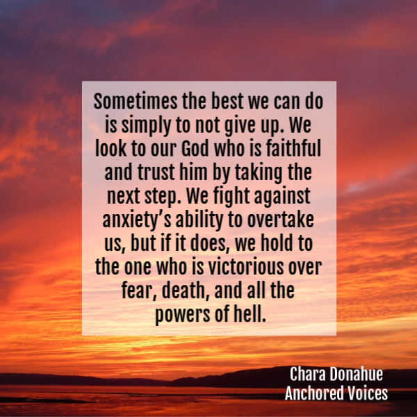 Sometimes the best we can do is simply to not give up. We look to our God who is faithful and trust him by taking the next step. We fight against anxiety’s ability to overtake us, but if it does, we hold to the one who is victorious over fear, death, and all the powers of hell. We work in the power of this promise, “The LORD himself goes before you and will be with you; he will never leave you nor forsake you. Do not be afraid; do not be discouraged.” Deuteronomy 31:8