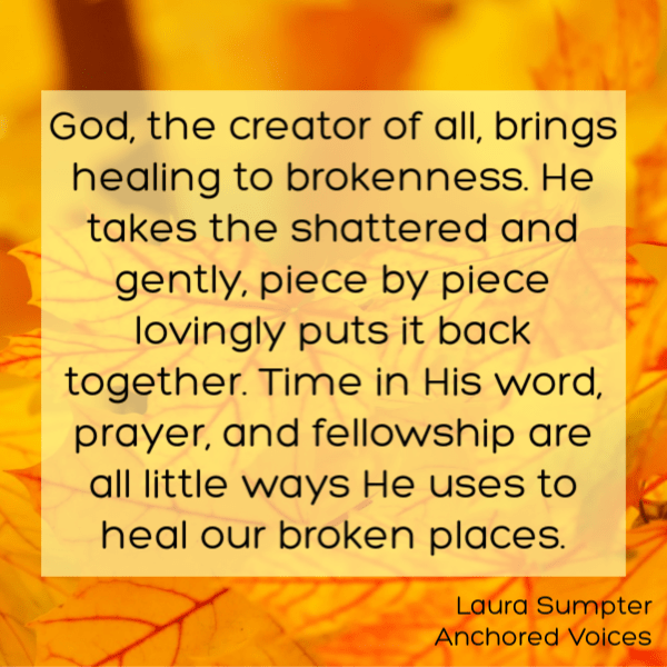 This verse was the promise I claimed during those long days and months. God, the creator of all, brings healing to brokenness. He takes the shattered and gently, piece by piece lovingly puts it back together. Time in His word, prayer, and fellowship are all little ways He uses to heal our broken places.