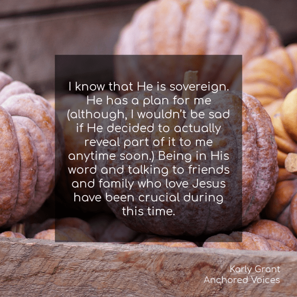 Karly Grant is a 30-something, single, enneargram 9, follower of Jesus who likes to keep life entertaining and real. The circumstances of the last few years of her life have held many twists and turns, but she can’t wait to see where God leads. She has a heart for adoption and is waiting to see where the Lord guides her on this path. She can often be found in a coffee shop, curled up with a good book, or spending quality time laughing and having fun with her family and friends.
