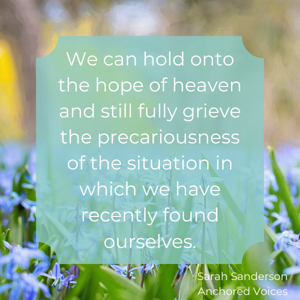 I don’t think it’s helpful when Christians gloss suffering with a glib you’ll-be-happier-in-heaven. Jesus knew he could raise his friend Lazarus from the dead, and still, he wept. The suffering we are experiencing right now is real. The deaths from coronavirus are tragic. The fallout from a hobbled economy may well be devastating. Our fears are valid. We can hold onto the hope of heaven and still fully grieve the precariousness of the situation in which we have recently found ourselves.