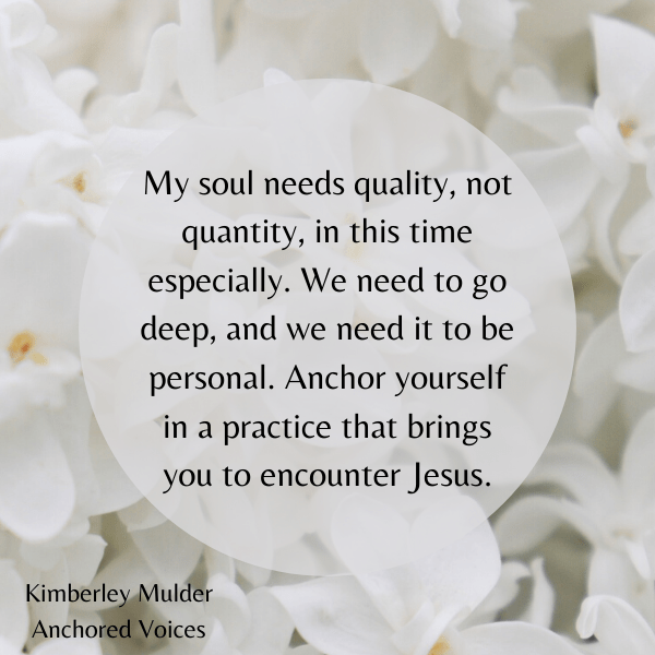 This has nothing to do with the quality or guidance of what I’m finding: it has everything to do with the state of my soul. No one else can give me what only God can give. I cannot consume encouraging messages, prayer videos, even blog posts like this one, and expect my soul to grow. My soul needs quality, not quantity, in this time especially. We need to go deep, and we need it to be personal. Anchor yourself in a practice that brings you to encounter Jesus. This tends to work best at the beginning of the day.