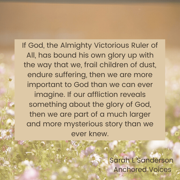 I believe this is a hopeful word for one simple reason: the God of this universe has tied himself to us. If God, the Almighty Victorious Ruler of All, has bound his own glory up with the way that we, frail children of dust, endure suffering, then we are more important to God than we can ever imagine. If our affliction reveals something about the glory of God, then we are part of a much larger and more mysterious story than we ever knew.