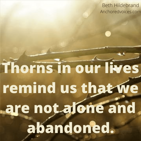 Thorns matter. Even though we don’t want them, even though they can hurt, we’re given the invitation to tell our story that includes thorns and how God allows them to stay so we’ll remember how we’re strengthened through his grace. Our physical and mental thorns can prompt us to recall the thorns of our suffering Lord and His love for us.